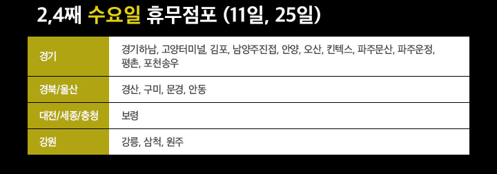 2,4째주 수요일 휴무 점포 : 11일, 25일