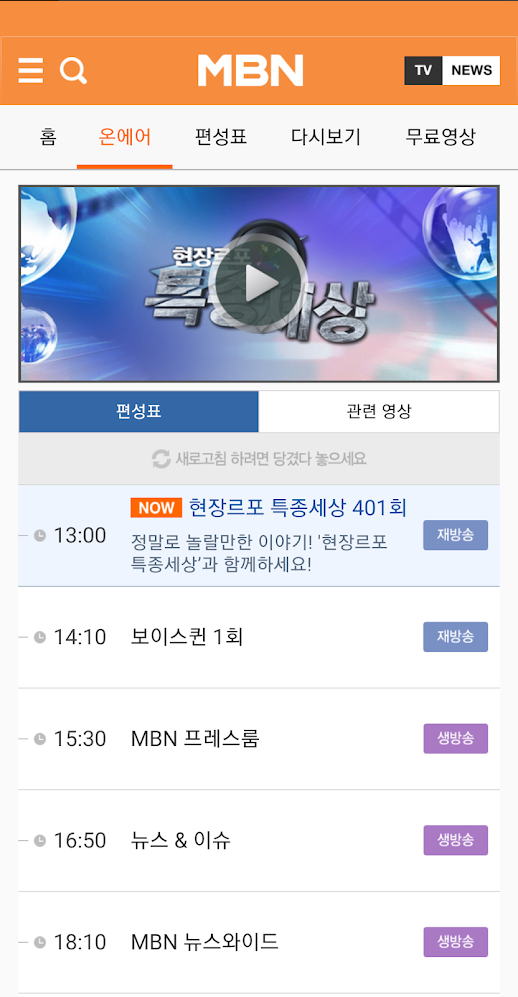 온에어에는 편성표와 관련영상으로 구성되어있으며, 보이스퀸과 MBN 프레스룸외 뉴스와이드 등의 생방송을 시청할 수 있습니다.