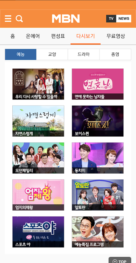 무료영상에는 다시보기를 통해 엄지제왕, 알토란, 동치미, 보이스퀸, 연애 못하는 남자들 등의 프로그램을 시청할 수 있고, 주요뉴스와 분야별 그리고 연예/스포츠 등의 구성과 즐겨찾기나 설정 등의 마이페이지를 활용할 수 있습니다.