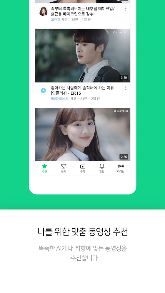 - 추천 : 인공지능 기술로 내 취향에 맞는 동영상을 찾아 보여줍니다.