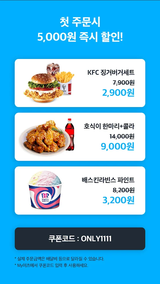 쿠팡이츠의 첫 주문 할인코드는 only1111 입니다. 유용하게 활용할 수 있을듯 합니다.