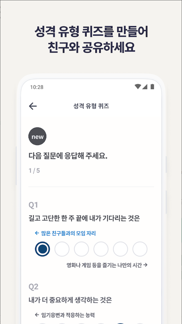 새로운 호불호 월드컵에서는 서로 퀴즈를 풀어보며, 미처 몰랐던 의외의 취향을 발견하실 수 있으며, 성격 유형 퀴즈를 통해 친구들이 보는 내 성격 유형은 무엇일지? 또, 타입스만의 빠르고 정확한 검사지로 3분 만에 퀴즈를 완성할 수 있어 빠르고 편리함이 큰 장점이라고 볼 수 있습니다.
