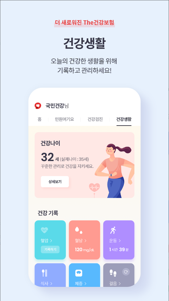 건강 보험 관리 공단의 The건강보험 국민건강 알람서비스로 주요 질환(8종)의 지역별 위험도를 미리 파악할 수 있고, 혈압, 혈당 등을 직접 기록하거나 기기 연동으로 꾸준히 건강을 관리할 수 있도록 구성되어 있습니다.