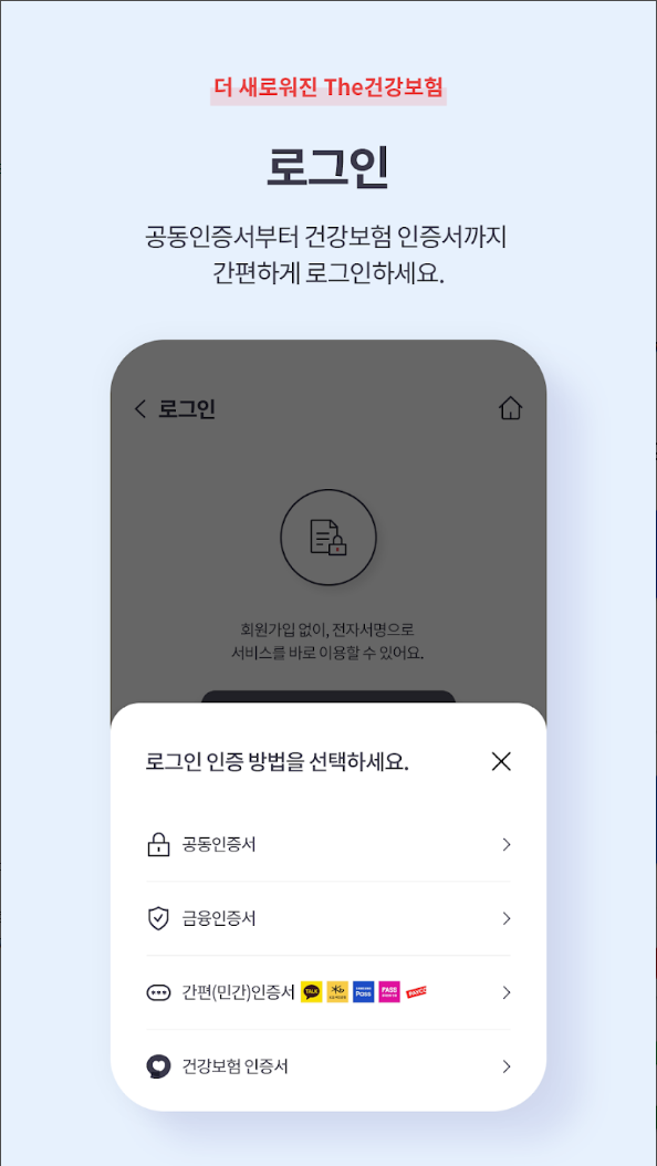 - 공동, 금융, 민간, 건강보험 인증서 등 8종의 다양한 인증 방식으로 로그인하여 이용할 수 있습니다.