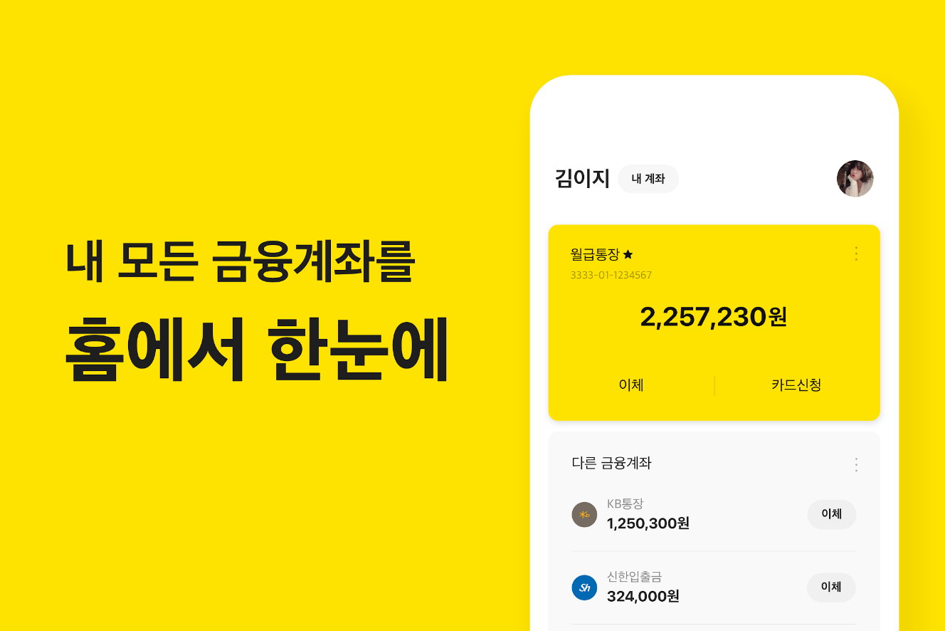 은행업무를 카카오뱅크 앱 하나로 예금, 적금, 대출, 해외송금, 체크카드, 모임통장, 내 신용정보까지