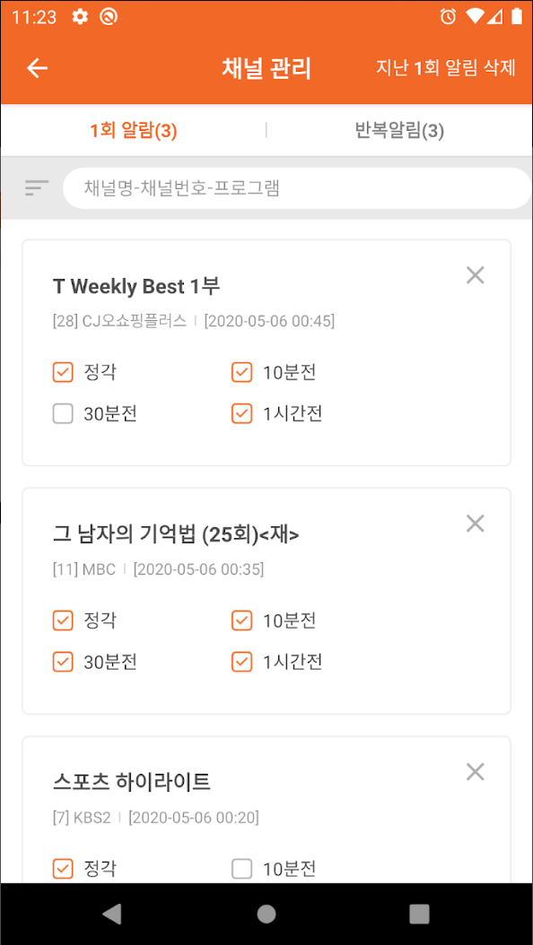 주요 기능으로 채널관리 기능이 있어 채널 등록과 삭제 그리고 선호채널 등록을 즐겨찾기 처럼 이용할 수 있으며, 스마트한 알림기능을 통해 1회알림 또는 반복알림 설정으로 지정해 놓은 방송이 결방되면 알림이 가지 않도록 구성되어 있어 역시 편리합니다.