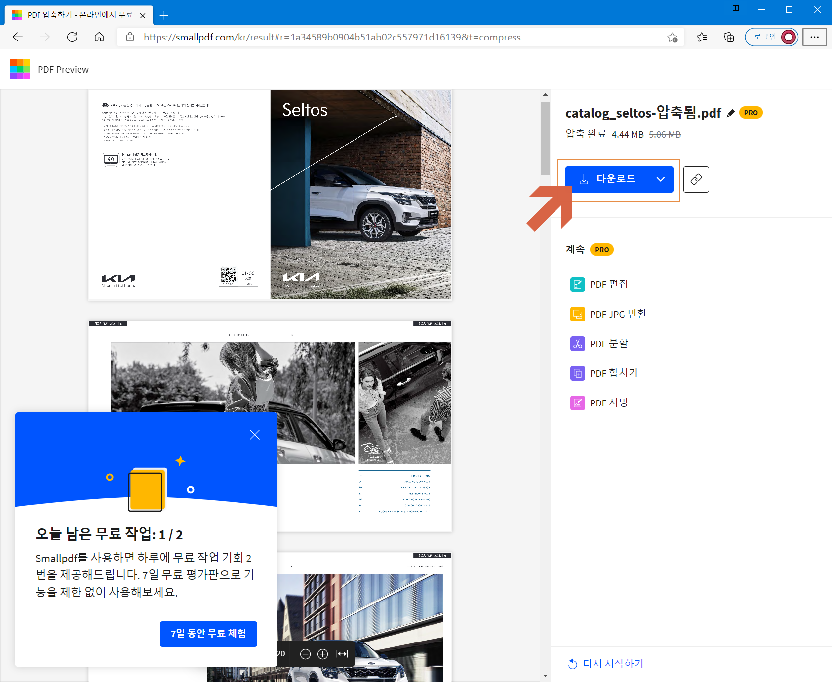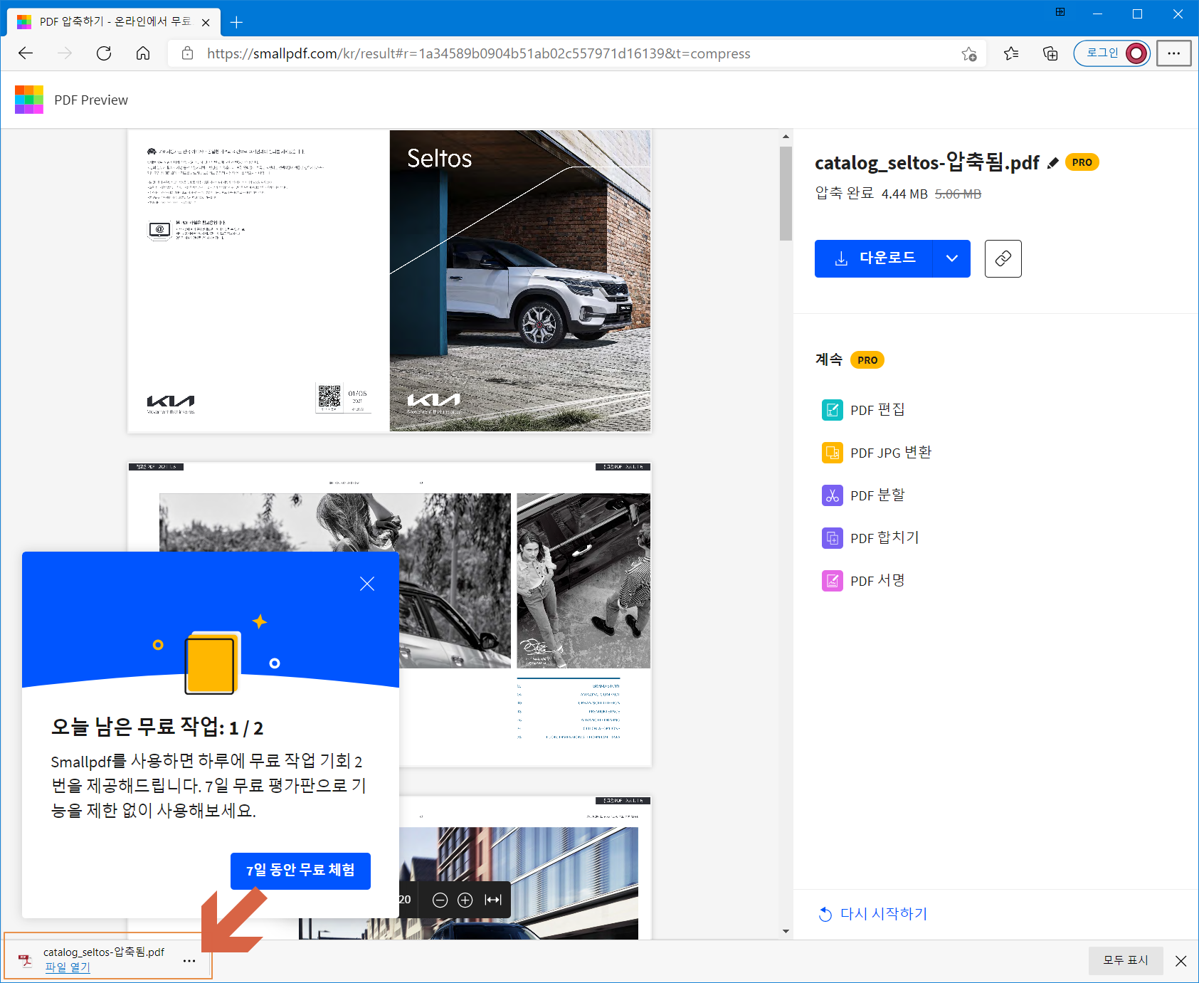 변환이 완료되었습니다. PDF 파일 원본 이름에 <-압축됨>이라고 붙었습니다. 이제 <다운로드>를 선택합니다.