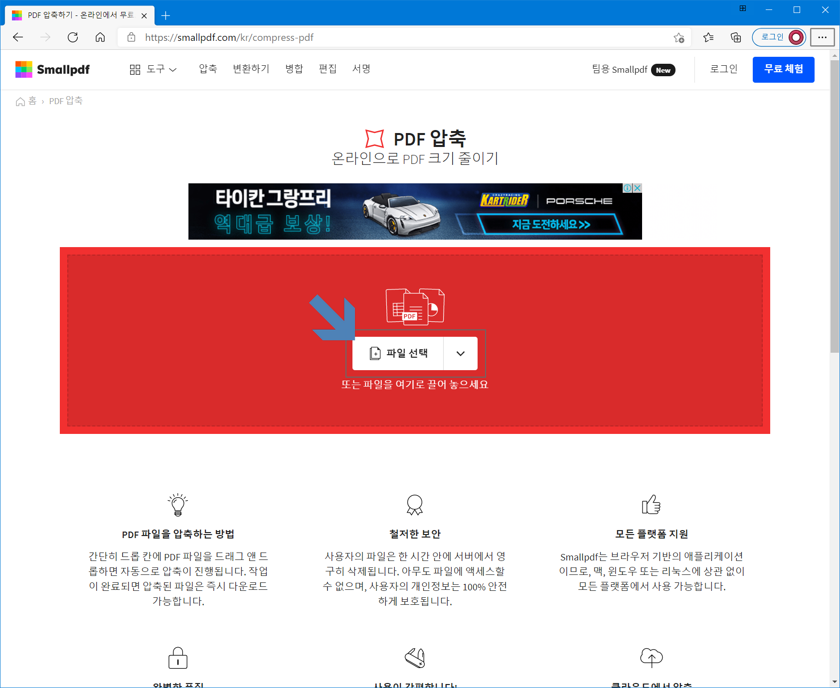 Smallpdf 사이트의 PDF 압축 기능 페이지로 접속합니다. <파일 선택>을 선택합니다.