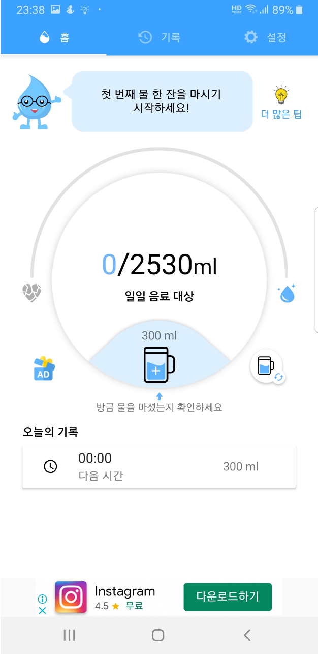 앱을 깔아서 몸무게와 몇 가지 정보를 입력했더니 하루에 거의 2.5리터를 마셔야 한다고 하네요.