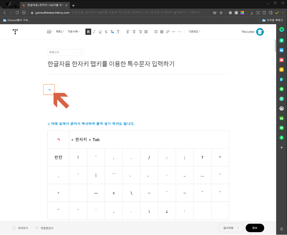 단지 한글자음과 한자키로만 사용을 했었는데, 탭키(TAB)를 추가하면 한눈에 확인할 수 있도록 가로로 펼쳐져서 한결 특수문자를 고르기 수월하게 됩니다.