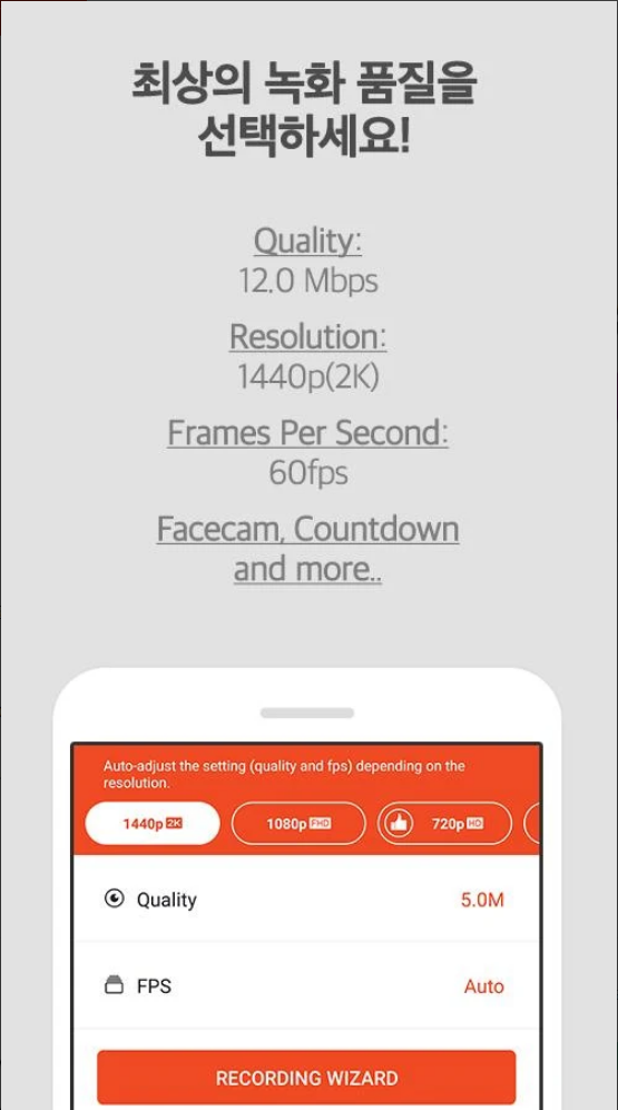 또, 다양한 영상편집 기능으로 (트림, 영상분리, 이미지 추출 등) 녹화된 영상의 퀄리티를 높여주고, 좋아하는 BGM 을 넣거나 나만의 인트로 & 아웃트로 영상 도 함께 넣을 수 있습니다. 워터마크 없이 깨끗하게 화면을 녹화할 수 있는 클린모드가 있고 화면녹화 를 생생한 FULL HD를 지원합니다. 최대 녹화품질 지원하여 녹화 해상도 1080P, 녹화 화질 12.0Mbps, 프레임 수 60fps까지 가능합니다.
