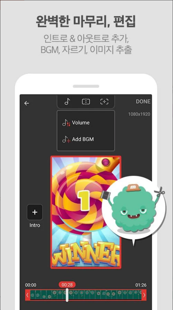 ㆍ좋아하는 BGM 을 넣거나 나만의 인트로&아웃트로 영상 도 함께 넣을 수 있어요!