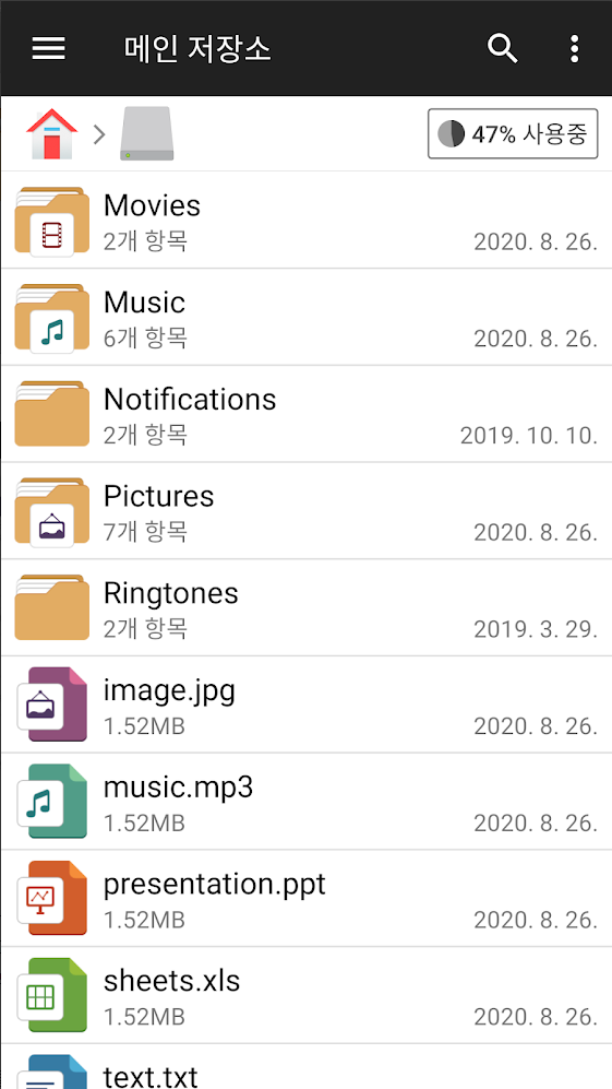 • 메인 스토리지: 로컬 기기 스토리지에 있는 모든 파일과 폴더를 관리할 수 있습니다.