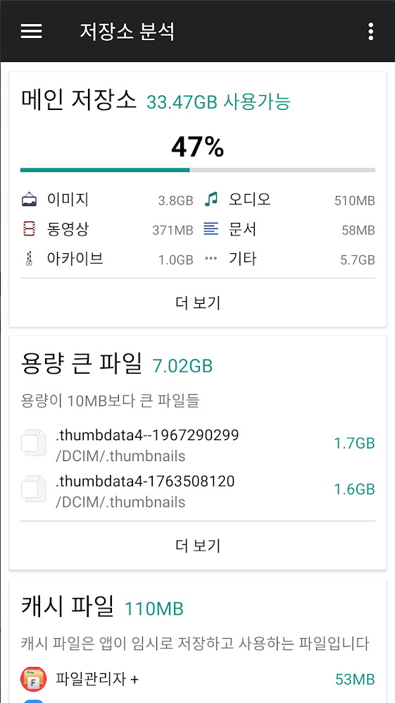 • 저장소 분석 : 로컬 스토리지의 쓸모없는 파일을 정리하기 위한 분석 기능을 제공합니다. 어떤 파일들이 용량을 차지하고 있는지 쉽게 살펴볼수 있습니다.