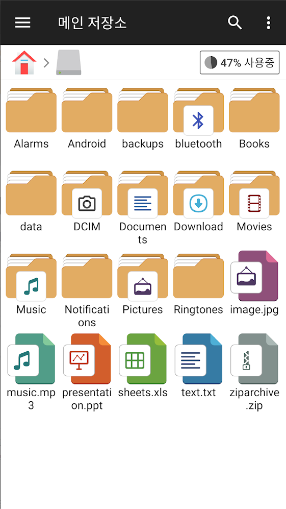 • 메인 스토리지: 로컬 기기 스토리지에 있는 모든 파일과 폴더를 관리할 수 있습니다.
