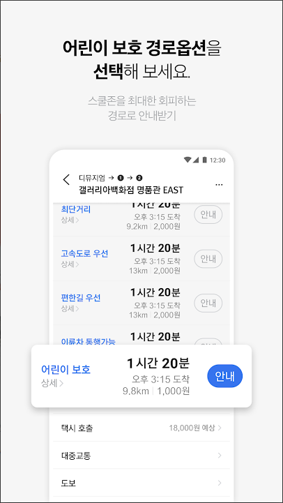 - 안전을 위해 스쿨존을 최대한 우회하는 경로로 안내합니다.