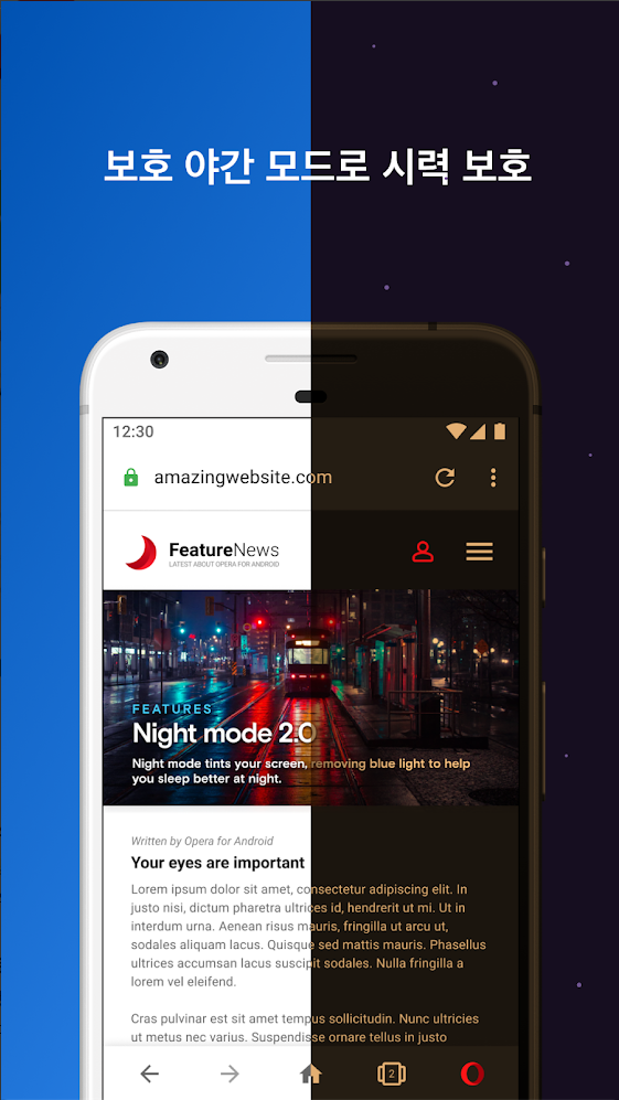 Opera 야간 모드는 조절 가능한 조명 옵션을 제공하여 어두운 환경에서 눈부심을 최소화하면서 가장 편안한 읽기 경험을 얻을 수 있습니다. 야간 모드 기능은 메인 메뉴에서 쉽게 찾을 수 있습니다.