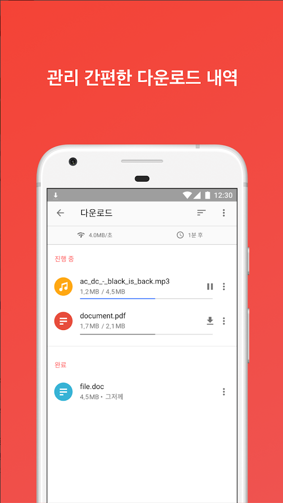 다운로드 관리 기능을 통해 그 어느 때보다 더 쉽고 빠르게 파일을 다운로드할 수 있습니다! 각각의다운로드 아이템을 쉽게 분류 및 공유하고, 오른쪽에서 왼쪽으로 밀어서 스마트폰에서 삭제하거나 다운로드 목록에서 빠르게 제거할 수 있습니다. 다운로드 중 백그라운드 다운로딩 기능도 제공하지만 앱을 하나 더 열어야 합니다!