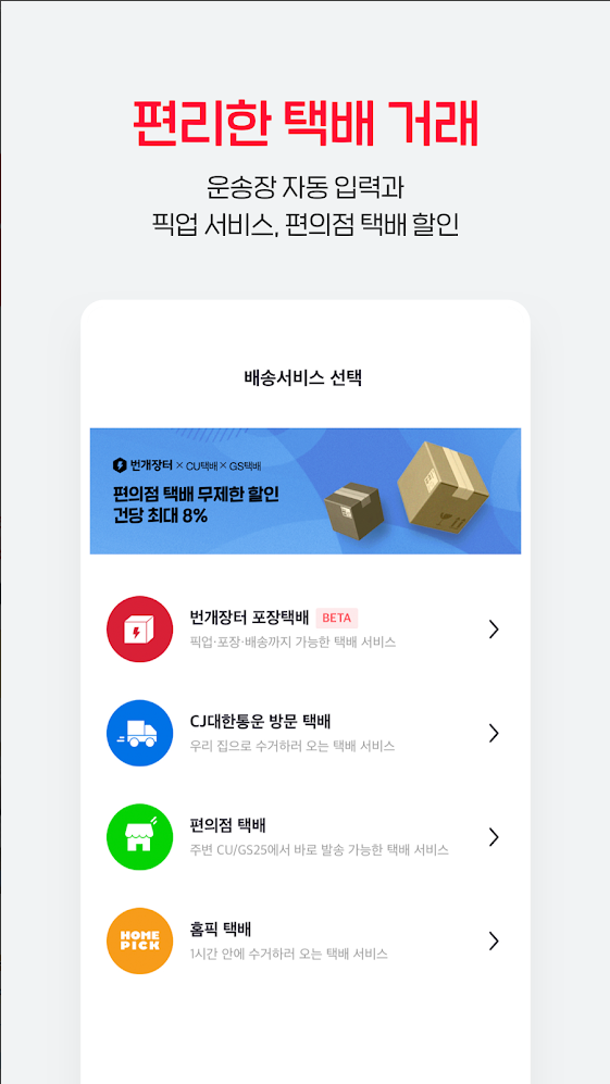 • 앱에서 방문택배, 편의점택배를 손쉽게 신청