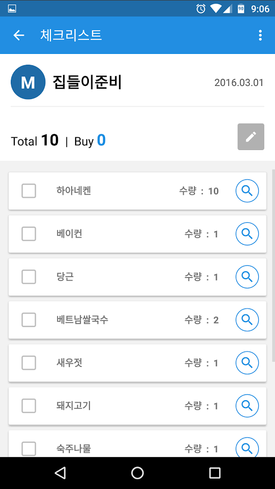 - 체크리스트화면에서 해당품목들의 각 마트별 최저가를 검색 할 수 있습니다. 꼭 물품들을 구매하기전에 인터넷 최저가 검색을 통해 가격정보를 확인하시고 구매하세요 ~