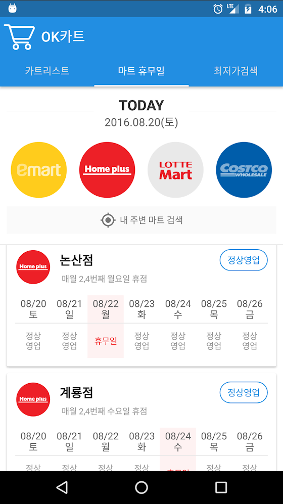 - 현재 위치와 가장 가까운 마트도 바로 검색 가능.
