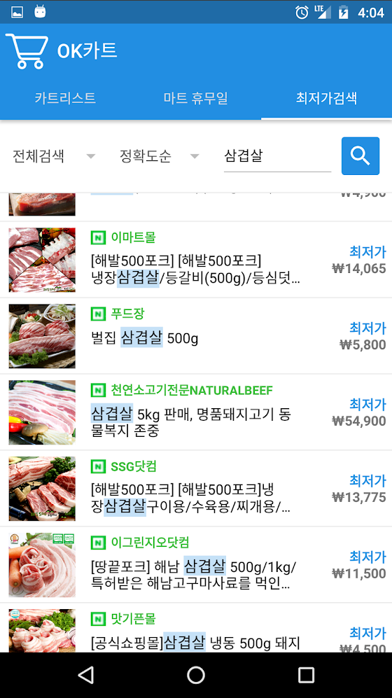 4) 마트별로 각 품목 '최저가 검색'
