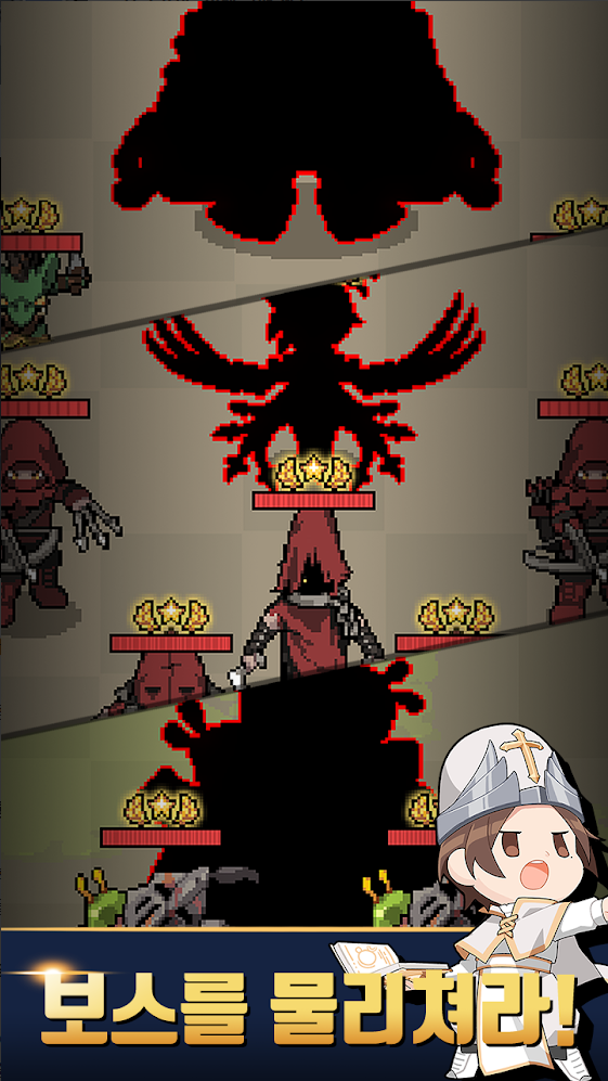 고전게임 감성의 도트 그래픽 속에서 내가 키운 영웅들이 적과 펼치는 전투를 지켜보는 재미가 있습니다. 영웅 레벨업과 영웅 간의 합체를 통해 더욱 강력한 팀을 만들어 새로운 스테이지에 도전하는 맛이 쏠쏠합니다.