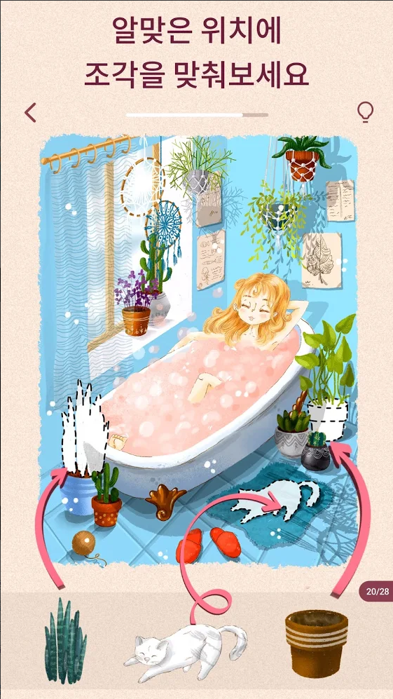 특별한 퍼즐을 풀며 휴식을 취할 수 있습니다. 알맞은 위치에 조각을 맞춰보세요.