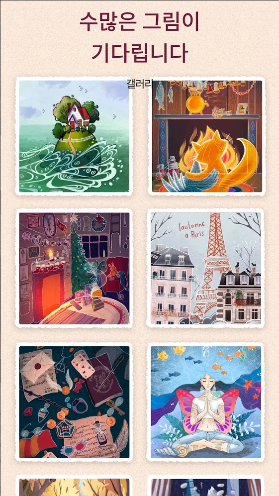 아름답고 창의적인 동화풍의 미술 작품들을 배경으로 퍼즐을 풀며 힐링하는 기분을 느낄 수 있습니다.
