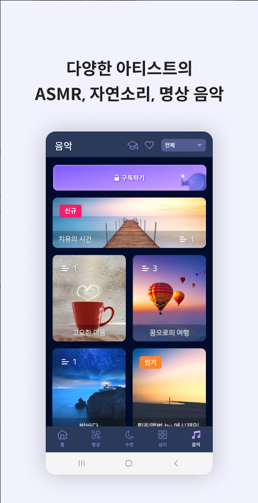 당신의 몸과 마음이 빠르게 편안해지도록 전문가의 명상과 심리, 음악, ASMR 음원을 제공합니다.