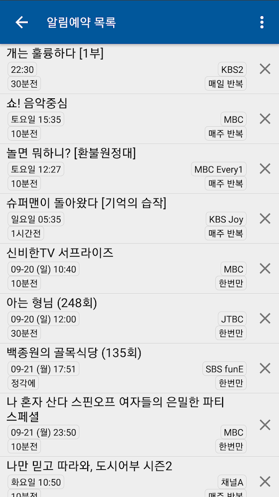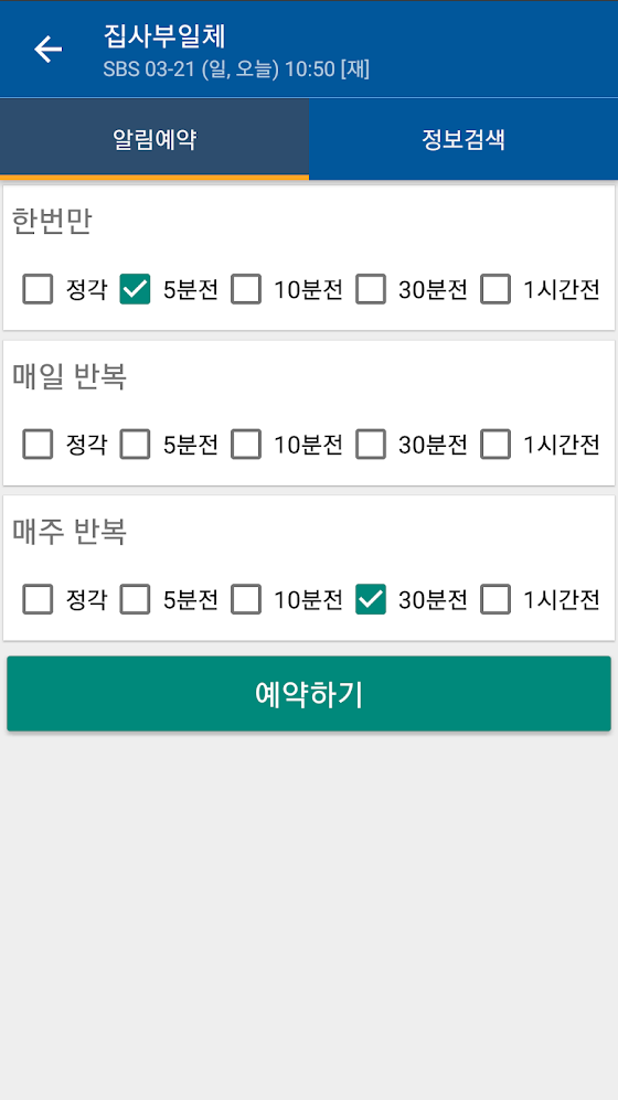 또, 방송 알림 예약을 통해서 프로그램 시작 전 미리 알림을 받을 수 있고, 알림 반복유형은 한번만 또는 매일반복과 매주반복 등의 상세한 설정을 지원합니다.
