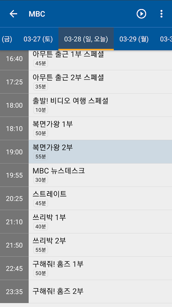 - 화면을 좌/우로 밀어서(스와이프) 다른날짜의 편성정보를 확인
