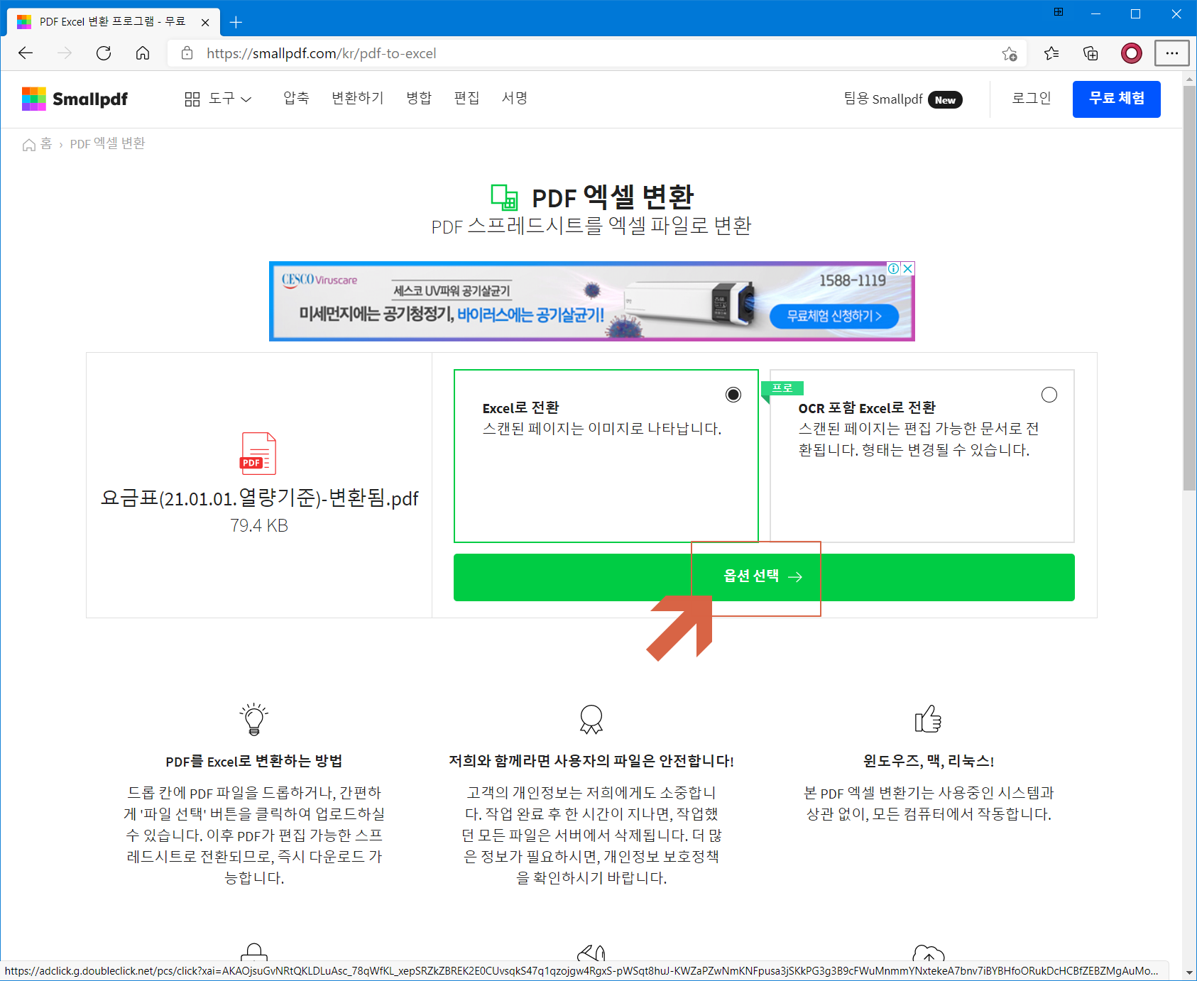 기존 PDF 파일이 업로드 완료되었으며, <Excel로 전환>에 체크 합니다.