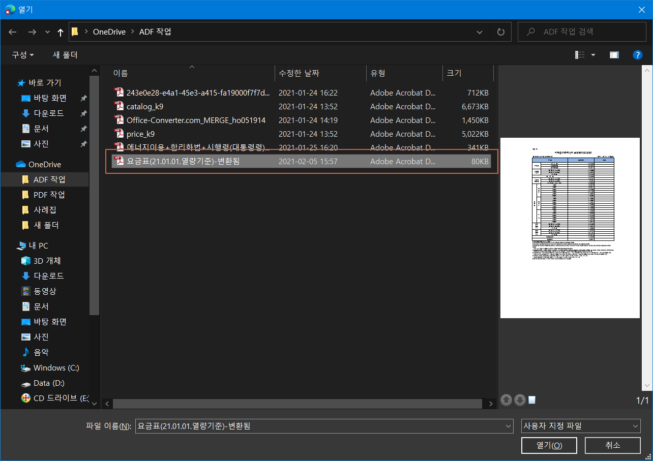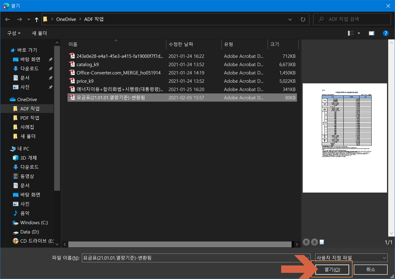 파일을 선택한 후 <열기>를 클릭합니다.