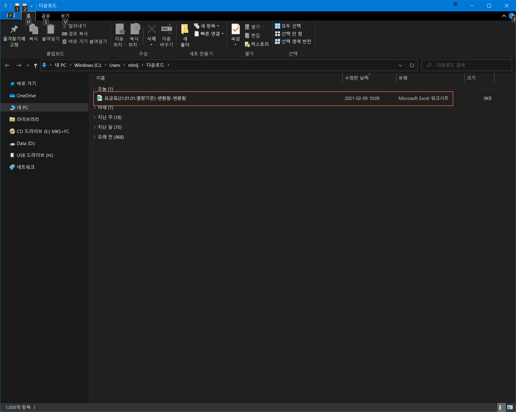엑셀 워크시트로 변환되어 다운로드된 모습입니다.