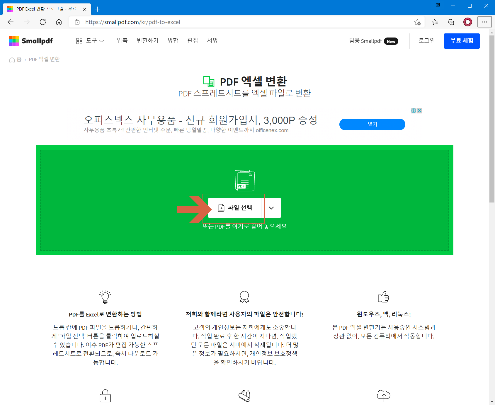 온라인 PDF 변환 사이트에 접속합니다. <파일 선택>을 클릭합니다.