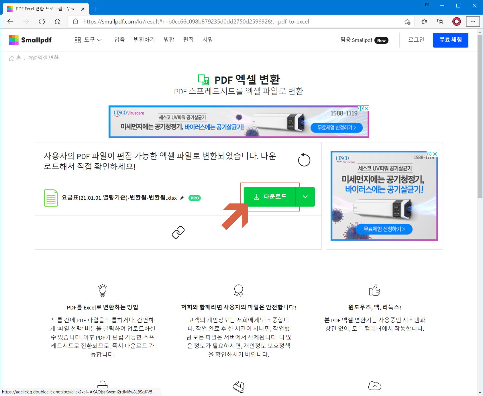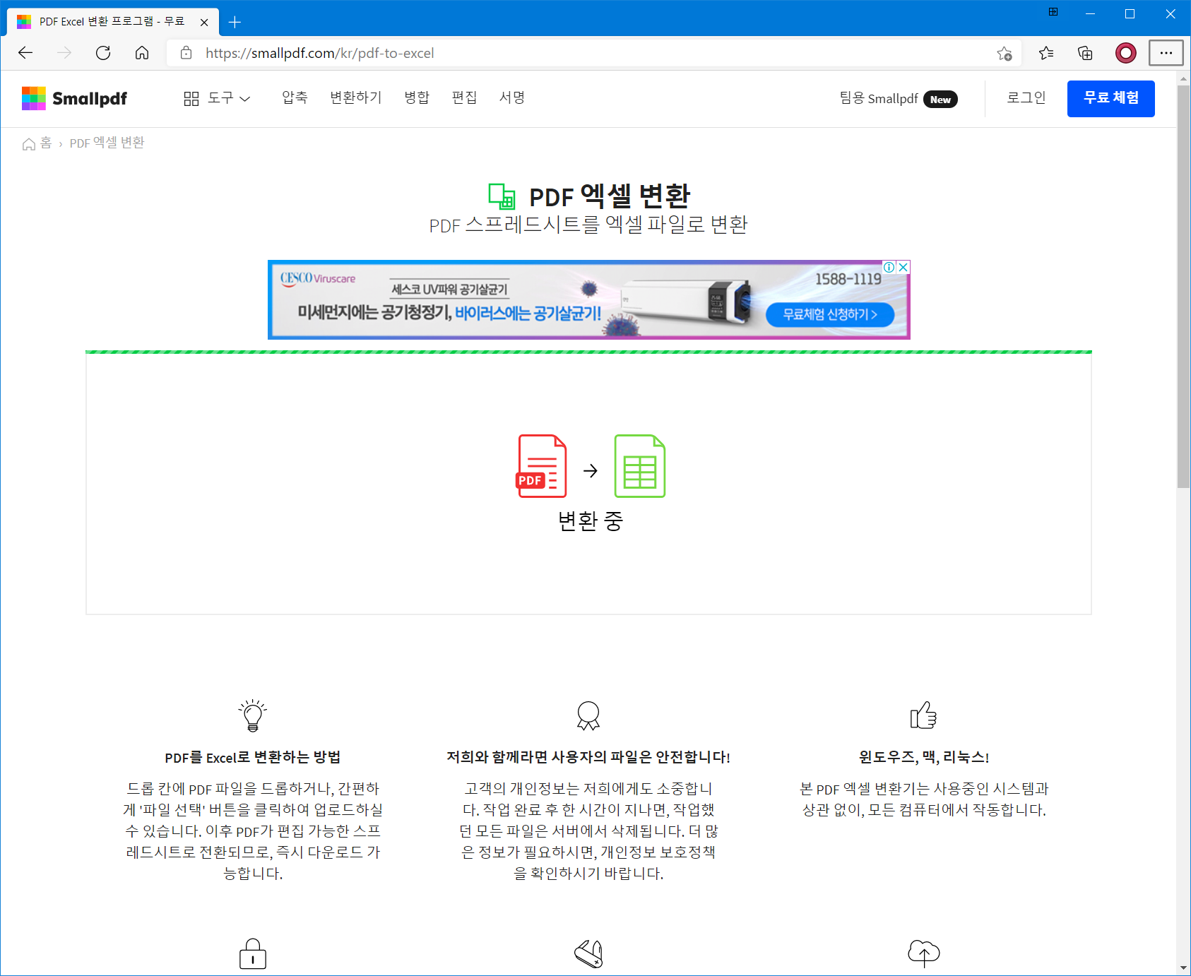 최고 품질의 변환 작업이라고 홍보하고 있으며, PDF를 Excel 파일로 전환하는 것은 번거로운 작업이지만 온라인으로 변환 시 품질을 유지하기 위해 노력하고 있다고 합니다.