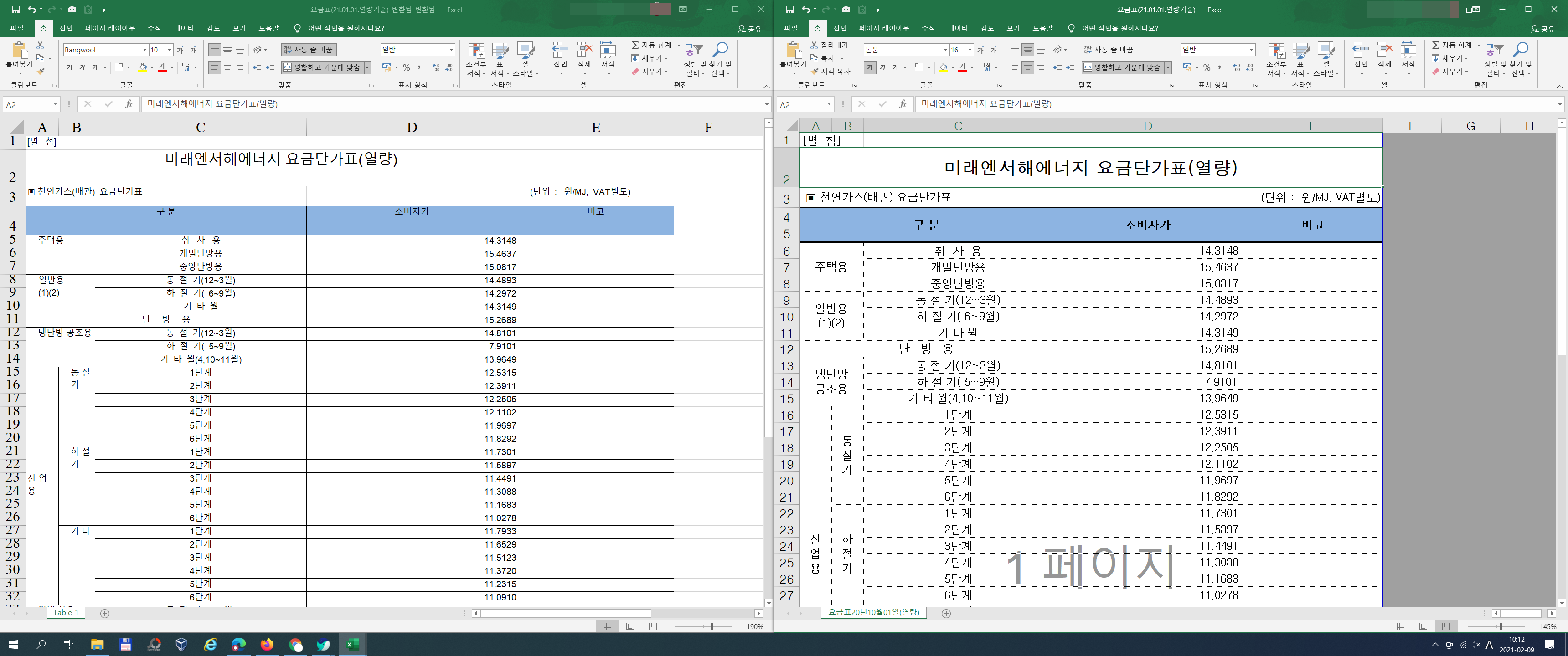 좌측이 PDF에서 엑셀 포맷으로 변환이 완료된 파일이며, 우측이 기존의 변환 이전의 원본 엑셀 파일입니다. 약간의 변화는 생겼지만 여전히 편집은 용이한 상태로 유지가 되었습니다.