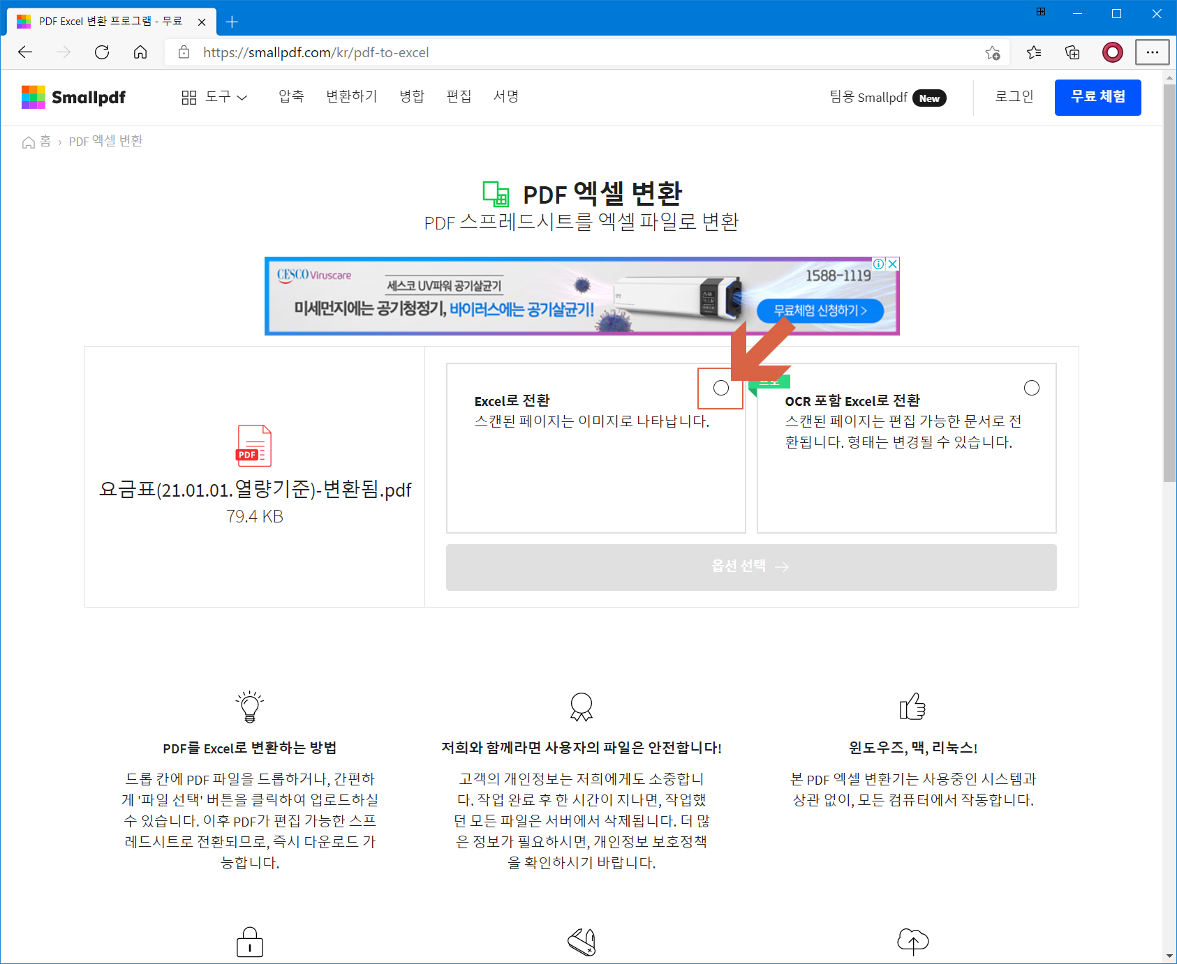 기존 PDF 파일이 업로드 완료되었으며, <Excel로 전환>에 체크 합니다.